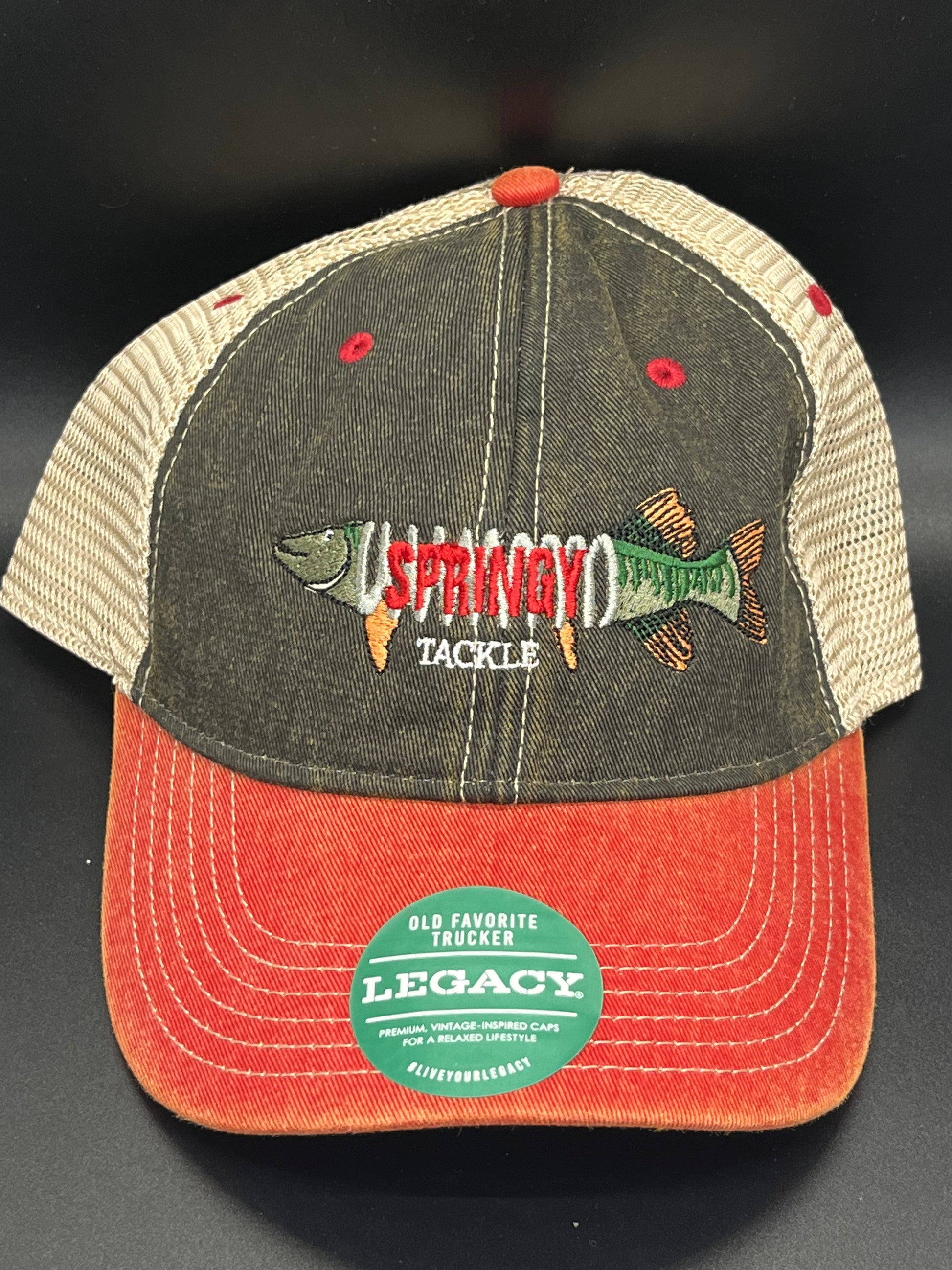 Springy Tackle stitching on a Legacy trucker style hat. Red brim with a charcoal front and tan sides and back.
